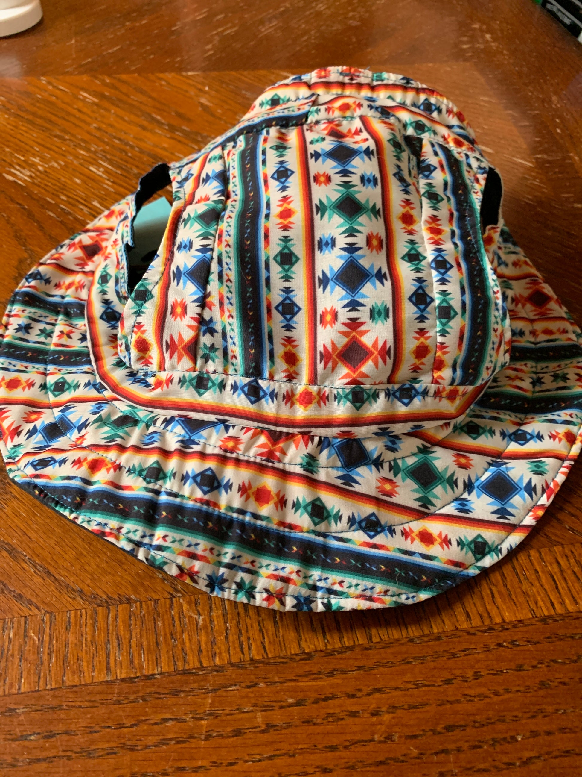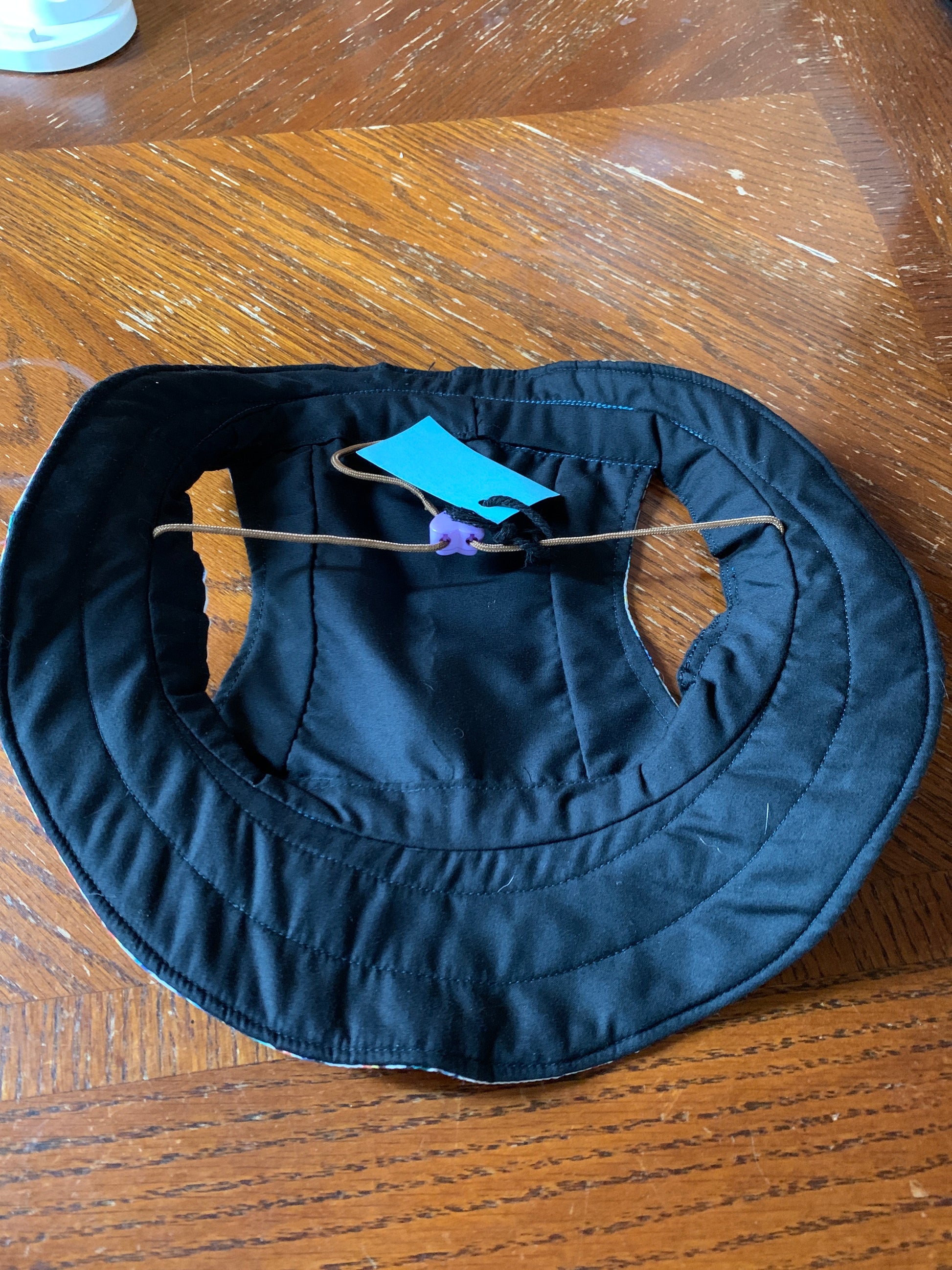 The Abstract Pet Bucket Hat is crafted from a durable cotton blend fabric, ensuring comfort and breathability. Its unique blue, orange, and green abstract pattern on a white background stands out while ear holes provide a secure fit. An adjustable tie enhances stability, and the reversible black cotton blend side offers versatility. This washable hat maintains its quality with repeated use, making it a practical choice for pet owners.
