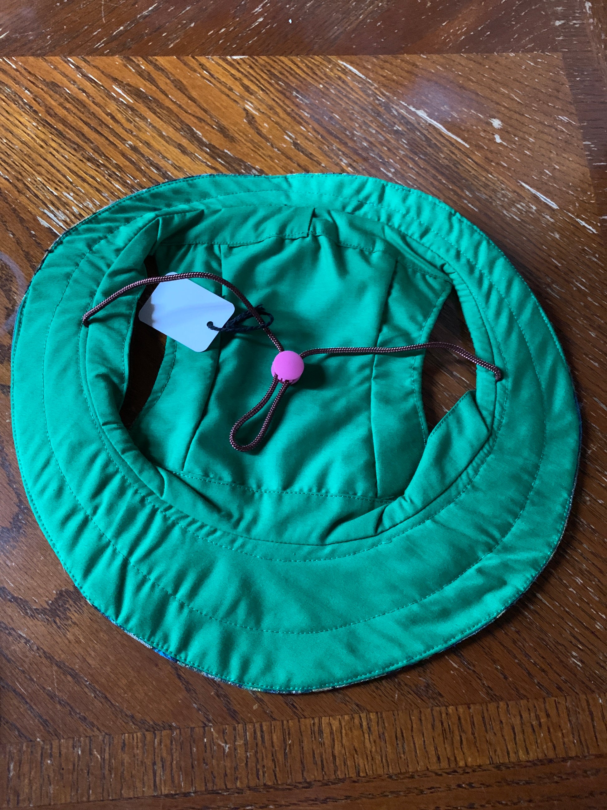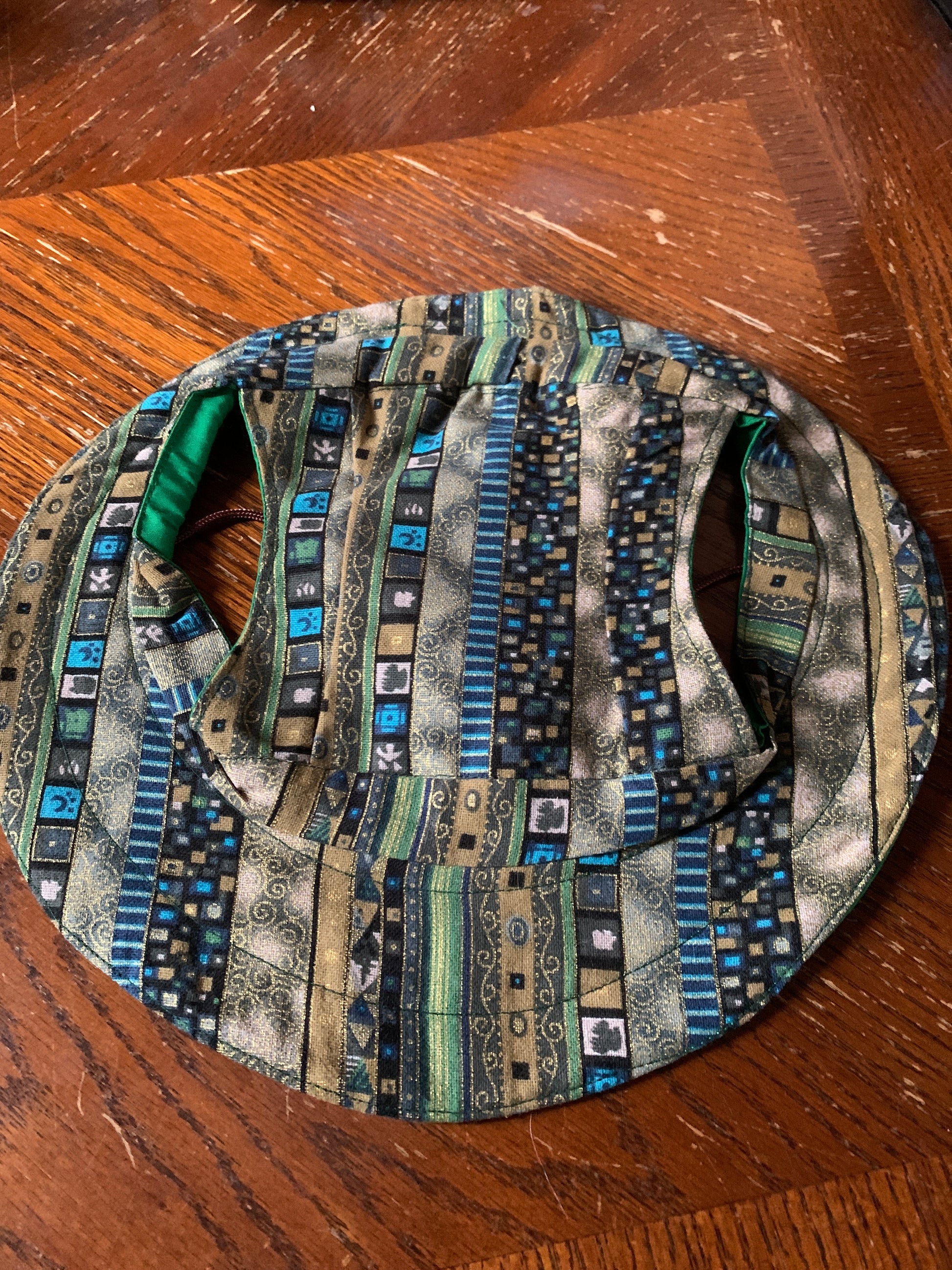 The Gold Sparkle Pet Bucket Hat is crafted from a durable cotton blend, featuring abstract designs that incorporate blue, green, and gold elements, enhanced by a subtle gold sparkle. Designed with ear holes for comfort and an adjustable tie for a secure fit, this hat is also reversible, offering versatility with its green cotton blend side. It is machine washable, ensuring ease of maintenance.