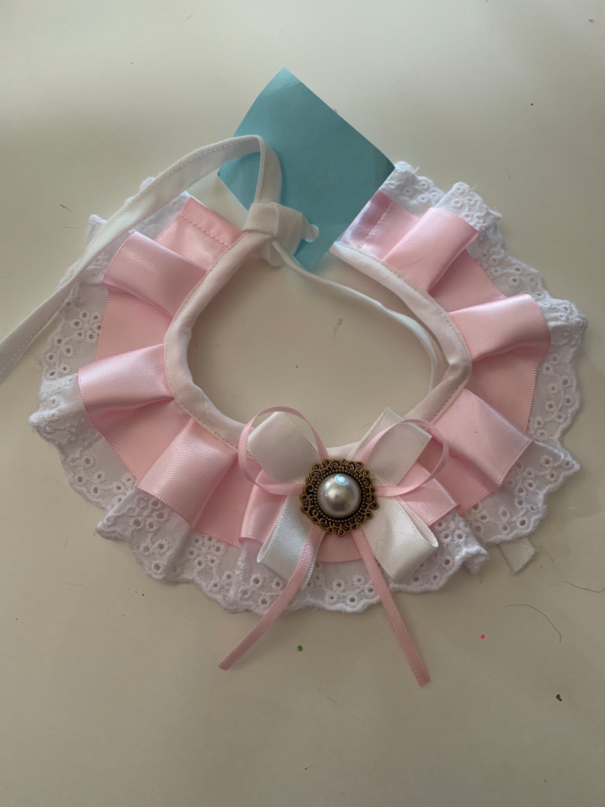 The Pink Satin Pet Lace Collar features a durable satin fabric and a light pink top layer combined with a decorative white eyelet lace bottom layer. This collar is designed with a white and pink bow adorned with gold and pearl accents, secured by a white cotton blend tie, ensuring both comfort and aesthetic appeal for your pet.