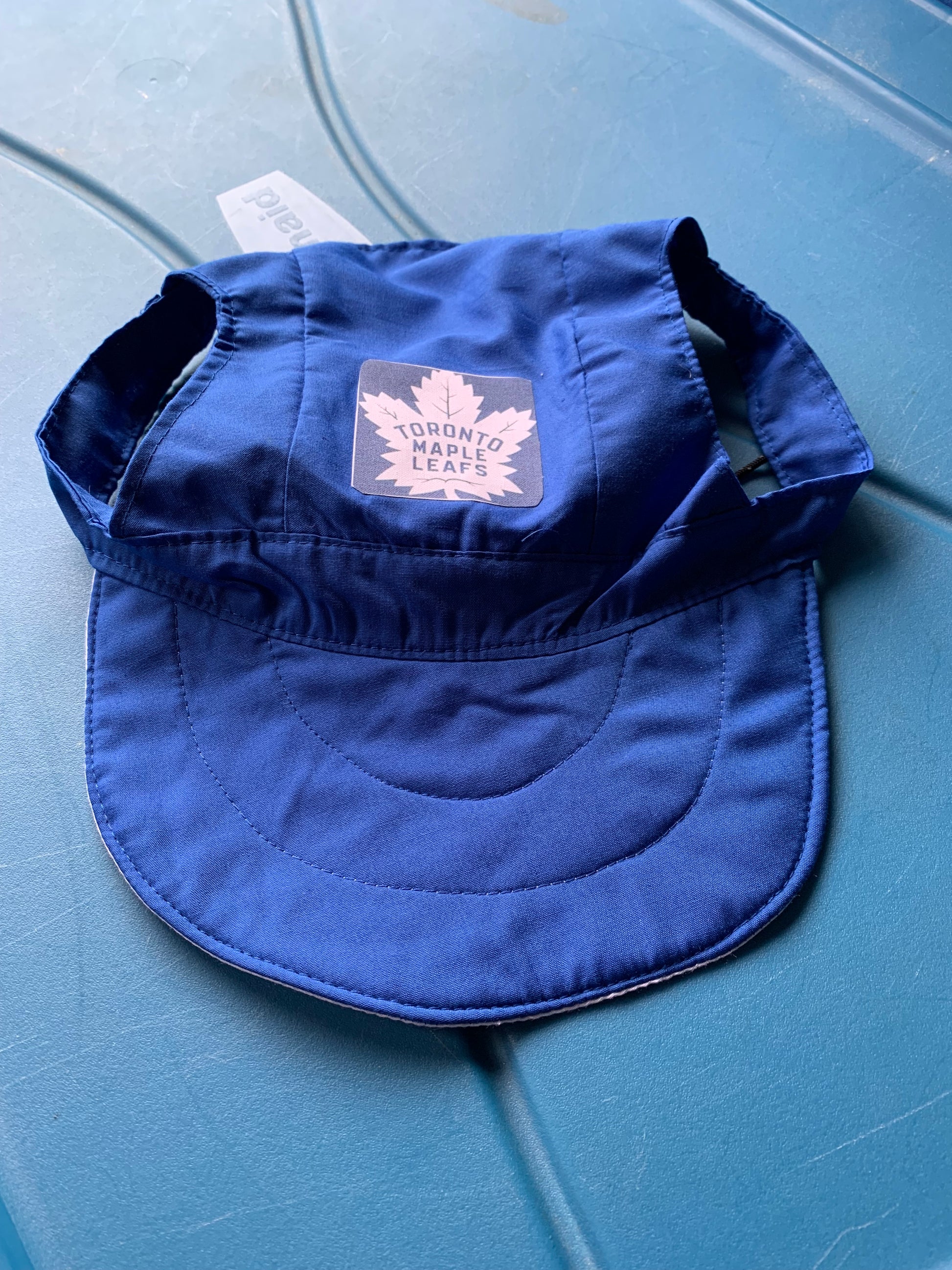 A bright hockey baseball pet hat done in Toronto maple leafs colors . Fabric is poly- cotton blend. Ear holes for ear freedom as well as an adjustable tie for a better fit for your pet.Reversible and washable.