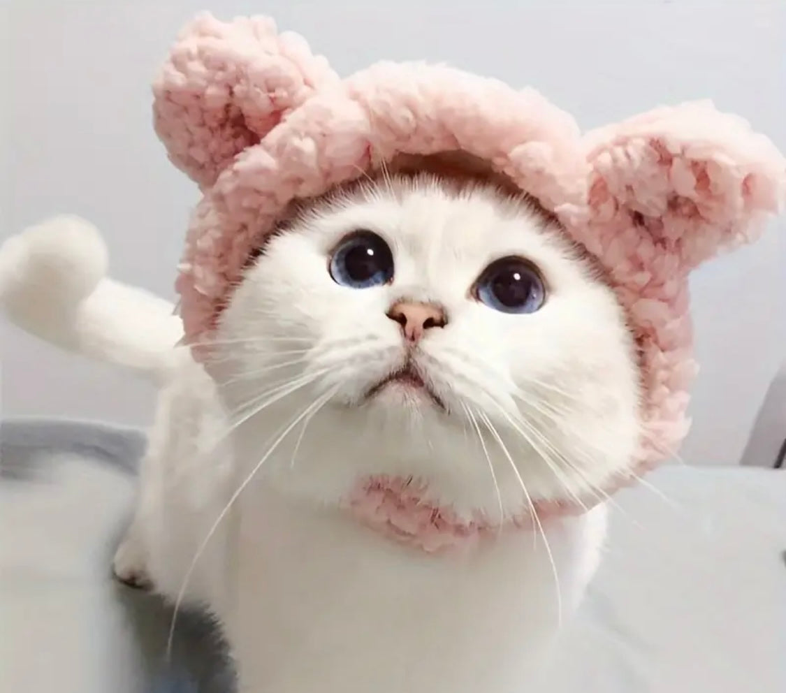 A cute cat hat in white polyester fabric with Velcro closure . One size