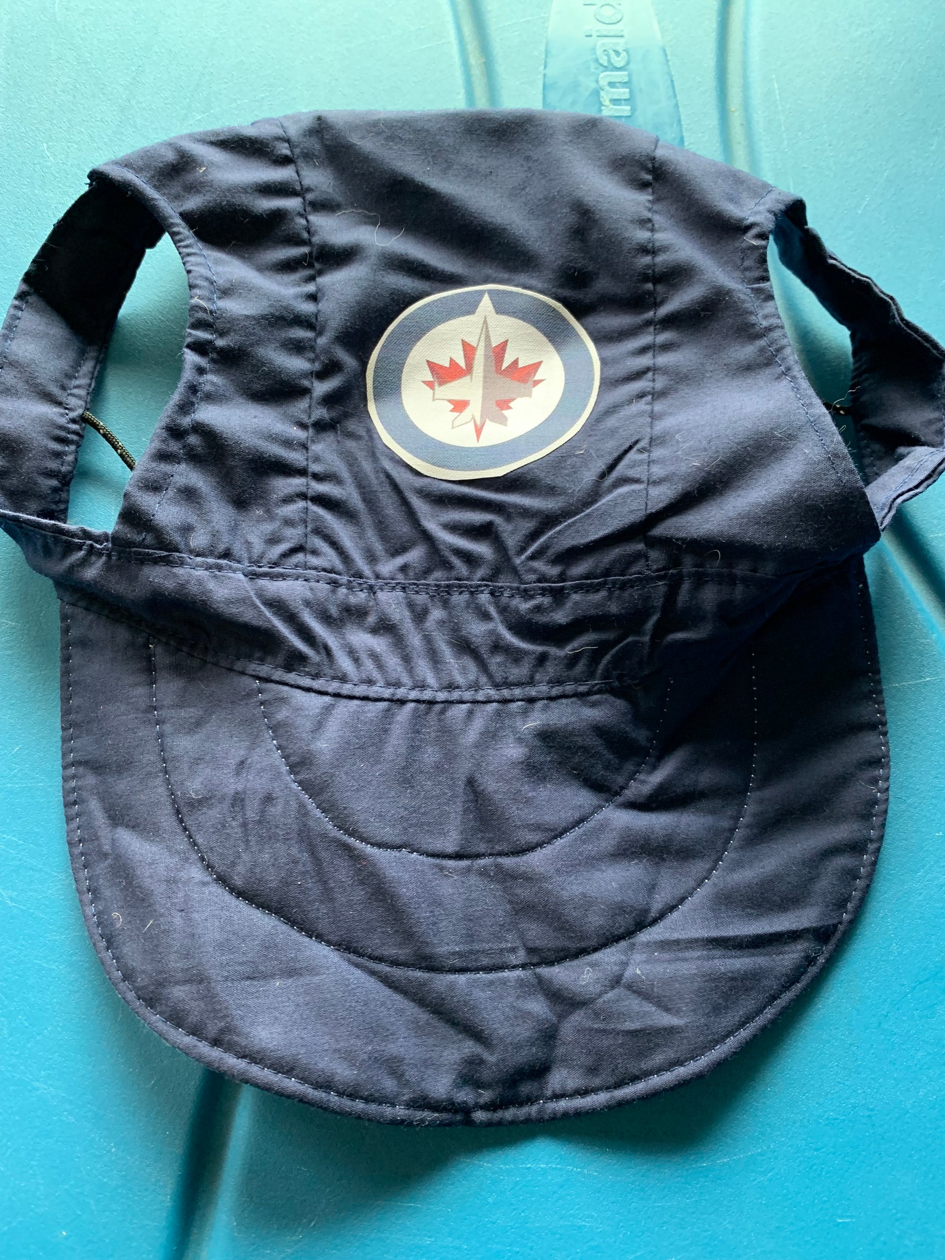 A poly-cotton blend pet baseball hat in the blue and white colors of Winnipeg jets. Ear holes for ear freedom as well as an adjustable tie for a better fit. Reversible and washable